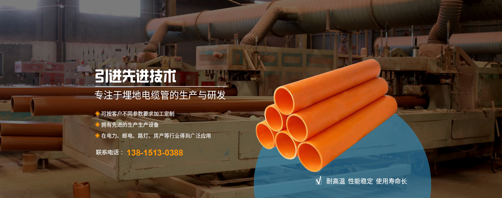 本廠創辦于2010年,全廠職工總數為42名,工程師技術人員5名,擁有國內先進的錐形雙螺桿、單螺桿擠出生產線9條,是專業生產PE頂管、PVC-U埋地式普通電力電纜管套、PVC-C高壓電纜套管、MPP電纜套管等管材、管件、BWFRP電纜管拉擠纏繞管。